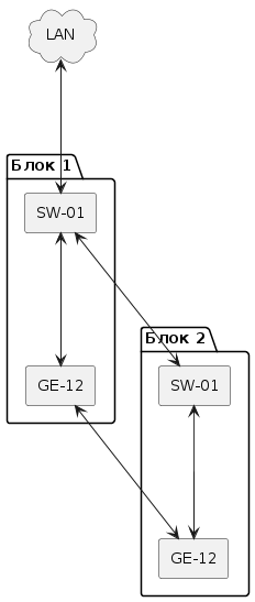 2.2 на обоих блоках прописать для GE-12 в первом слотеpath cost10; для GE-12 в третьем слоте -path cost100; поставить чекбоксыenabled. - Блок 1 и Блок 2 соединить согласно схеме через медные порты плат GE-12 с помощью патчкордов.