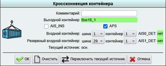 На вкладке "Кроссконнекция" в плате ST-04 при настройке контейнера есть всплывающее окно "Кроссконнекция контейнера". В этом окне есть поля "AIS0_DET", "AIS1_DET", "Текущий источник".